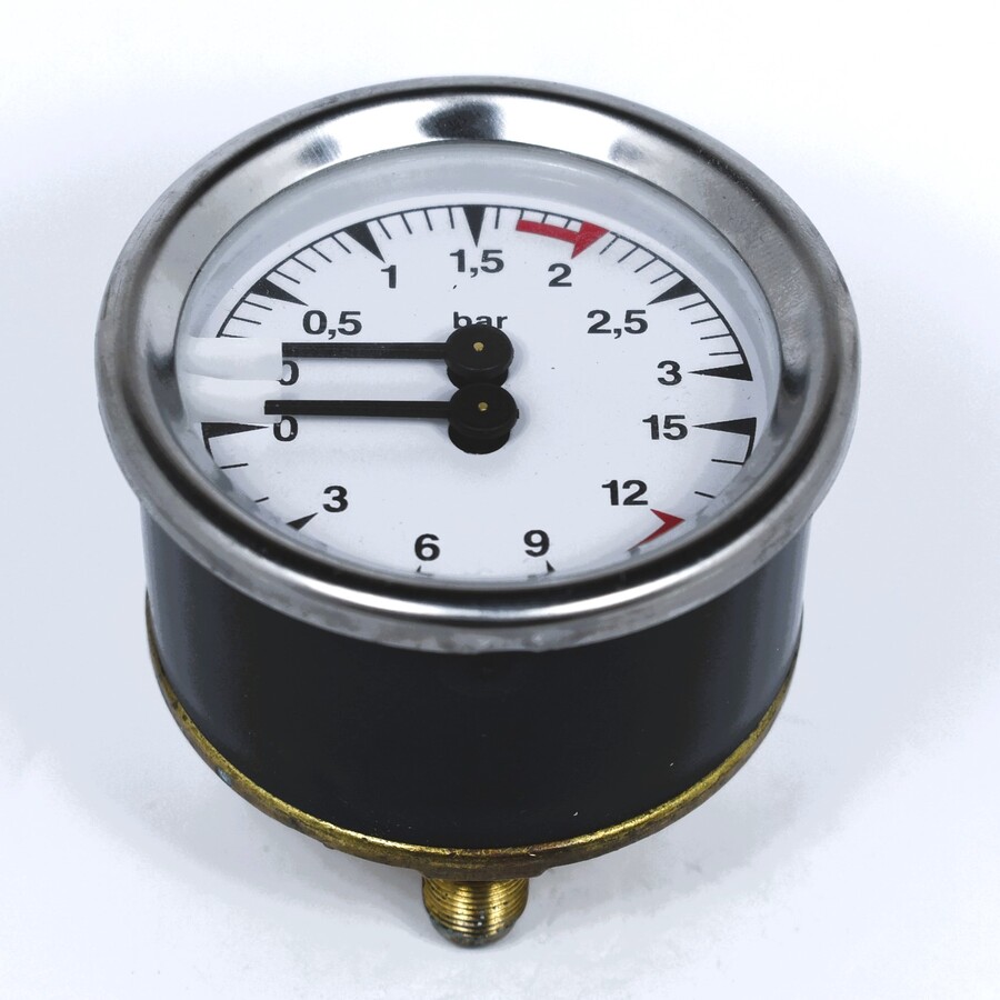 Convex fittings. Double scale 0-3 bar / 0-15 bar. Fittings 1/8''M. Body DIA 60mm. Frame DIA 65mm. For coffee machines Faema (E64 ,E66), La Marzocco.