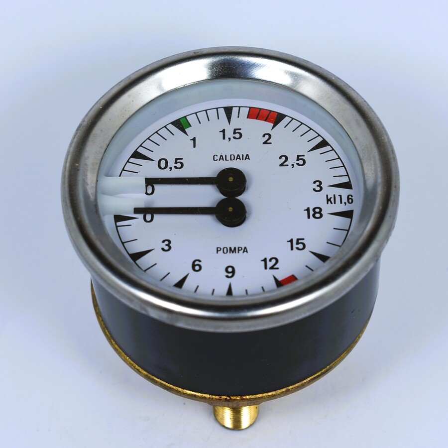 Double scale 0-3 bar / 0-18 bar. Fittings 1/8"M. Body DIA 60mm. Frame DIA 65mm. For coffee machines Ducale, Fiorenzato C.S. (MURANO).