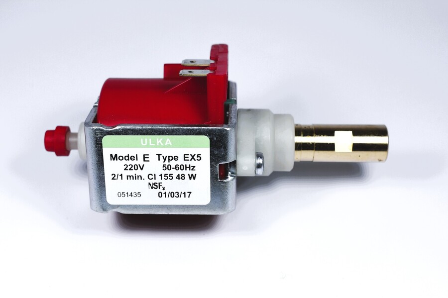 The Ulka Vibratory Pump is the model powering most Italian/European domestic espresso machines. This is the EX5 48w 1/8 inch bsp thread brass outlet model. Ulka products are extremely reliable but should a pump need replacing then the job is not difficult.